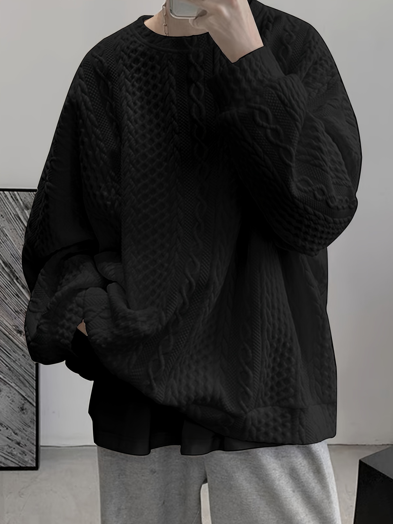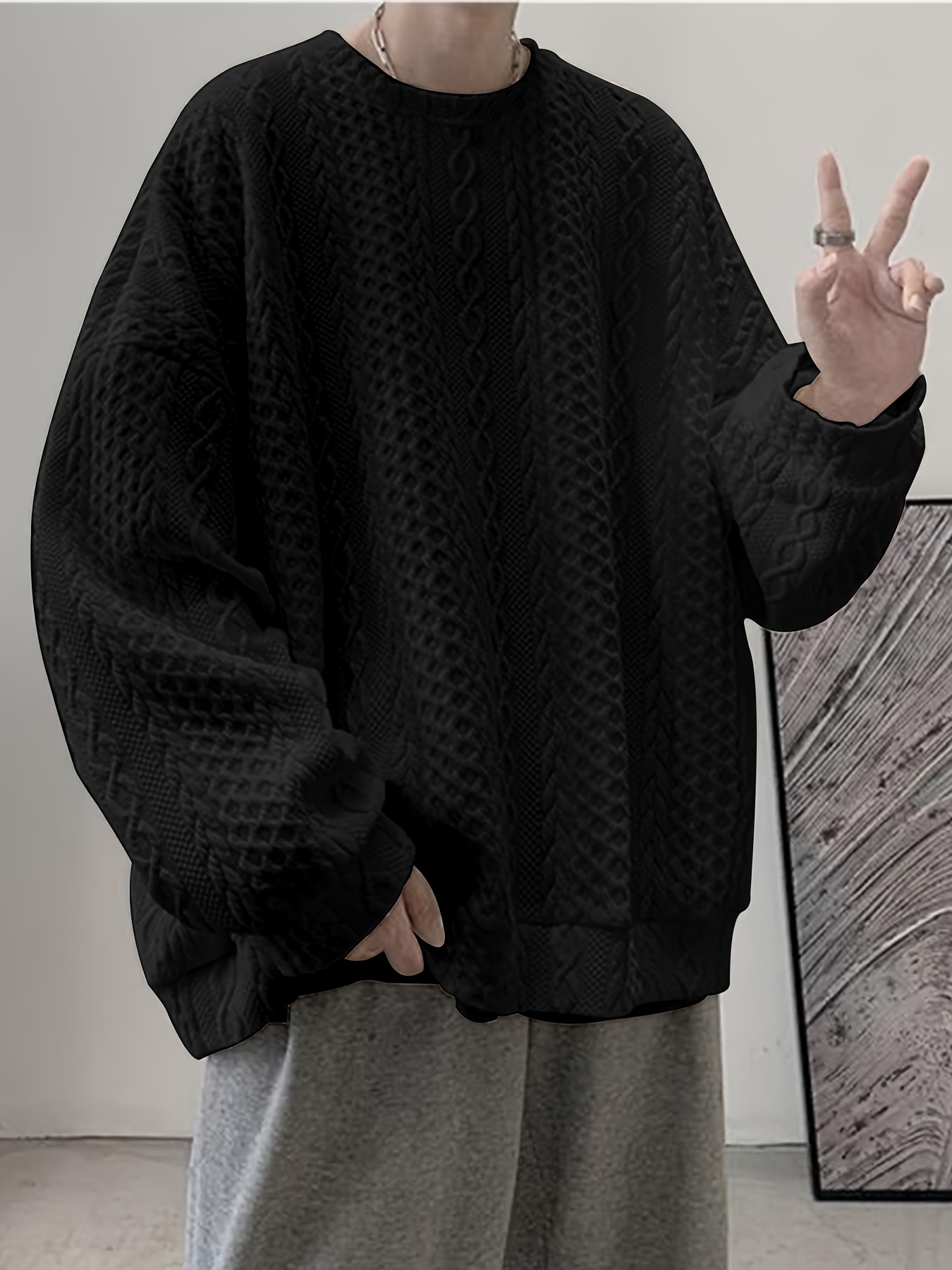 Trendy Cable Sweatshirt, Men's Casual Solid Crew Neck Sweatshirt For Men Fall Winter
