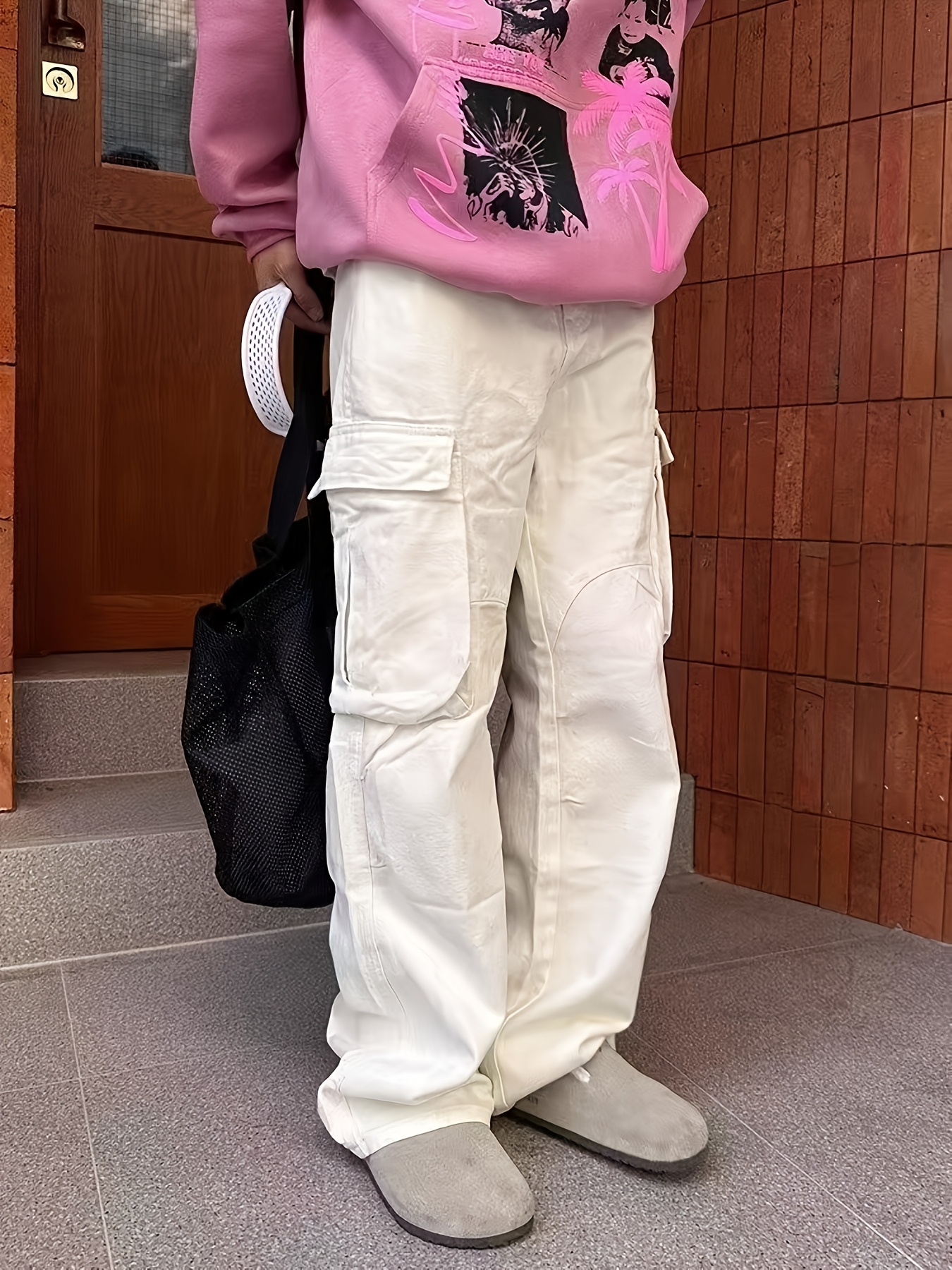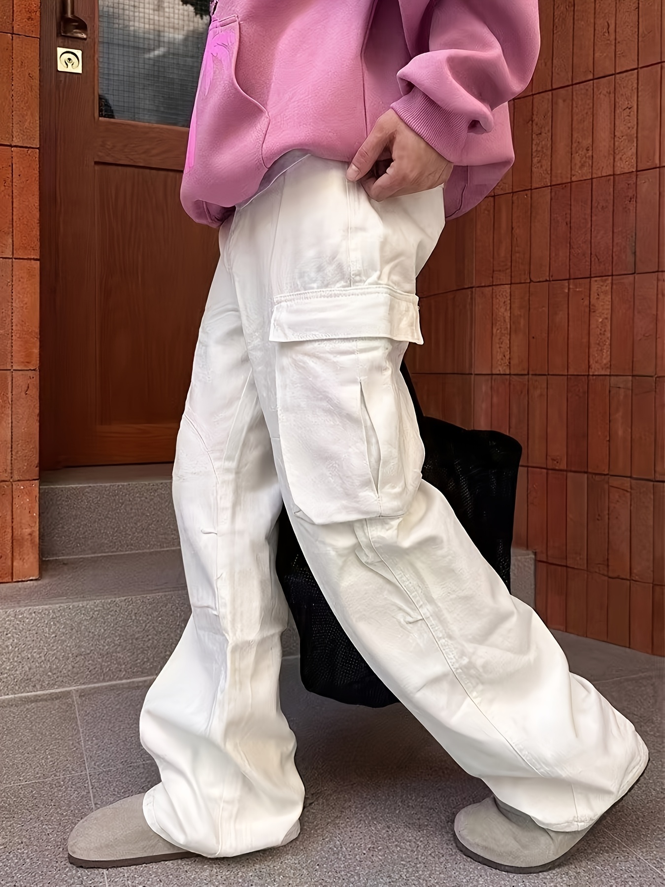Men's Trendy White Cargo Jeans - Straight Leg, Multi-Pocket Design, Cotton Blend, Machine Washable