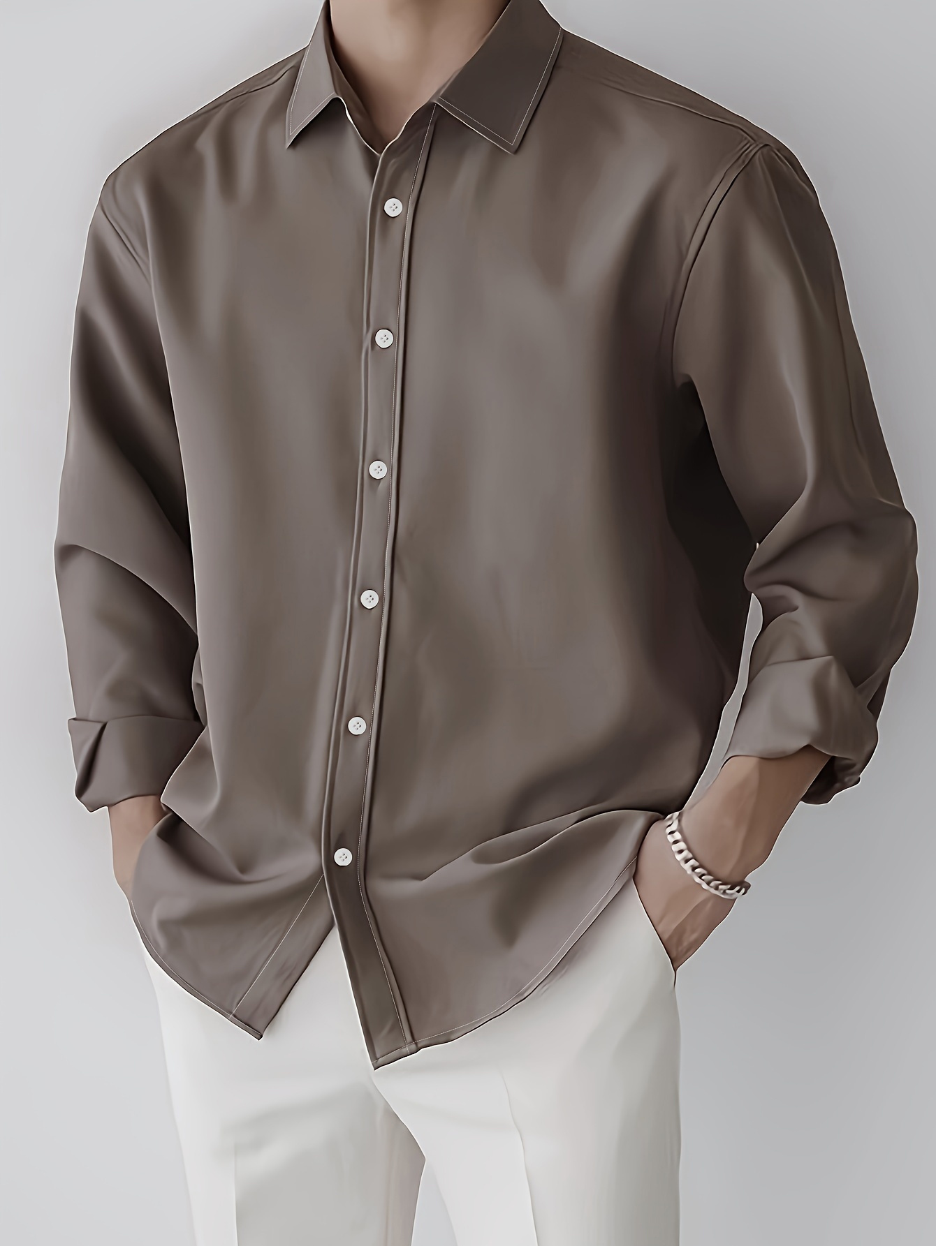 European And American Men'S Fashion Khaki Long-Sleeved Shirt, Skin-Friendly And Breathable Street Solid Color Fashion Button-Down Lapel Shirt