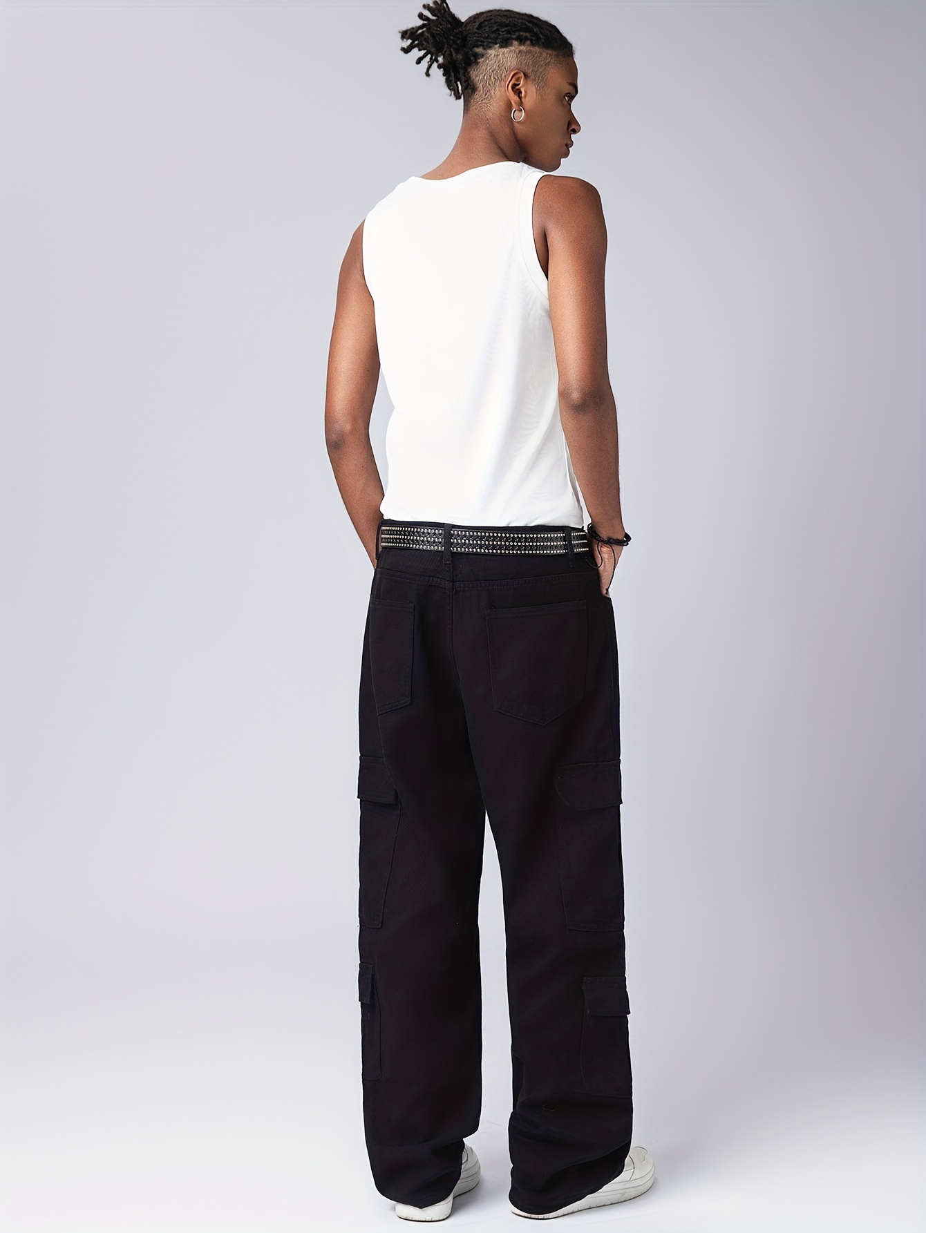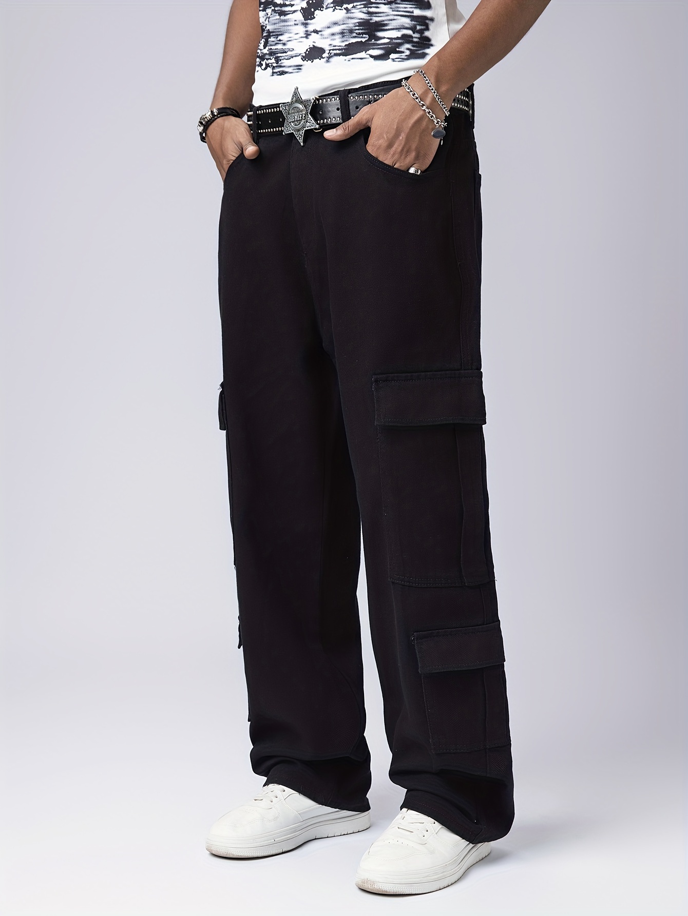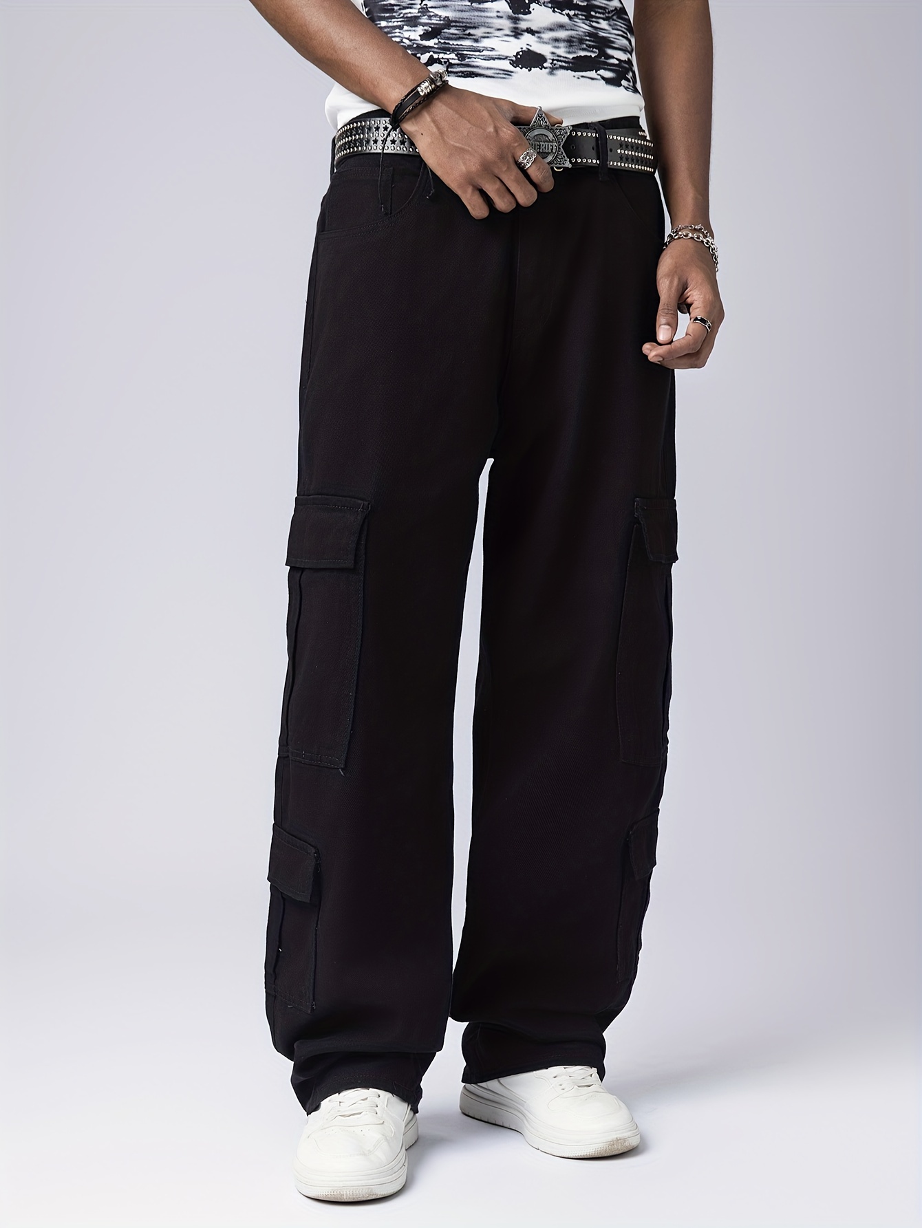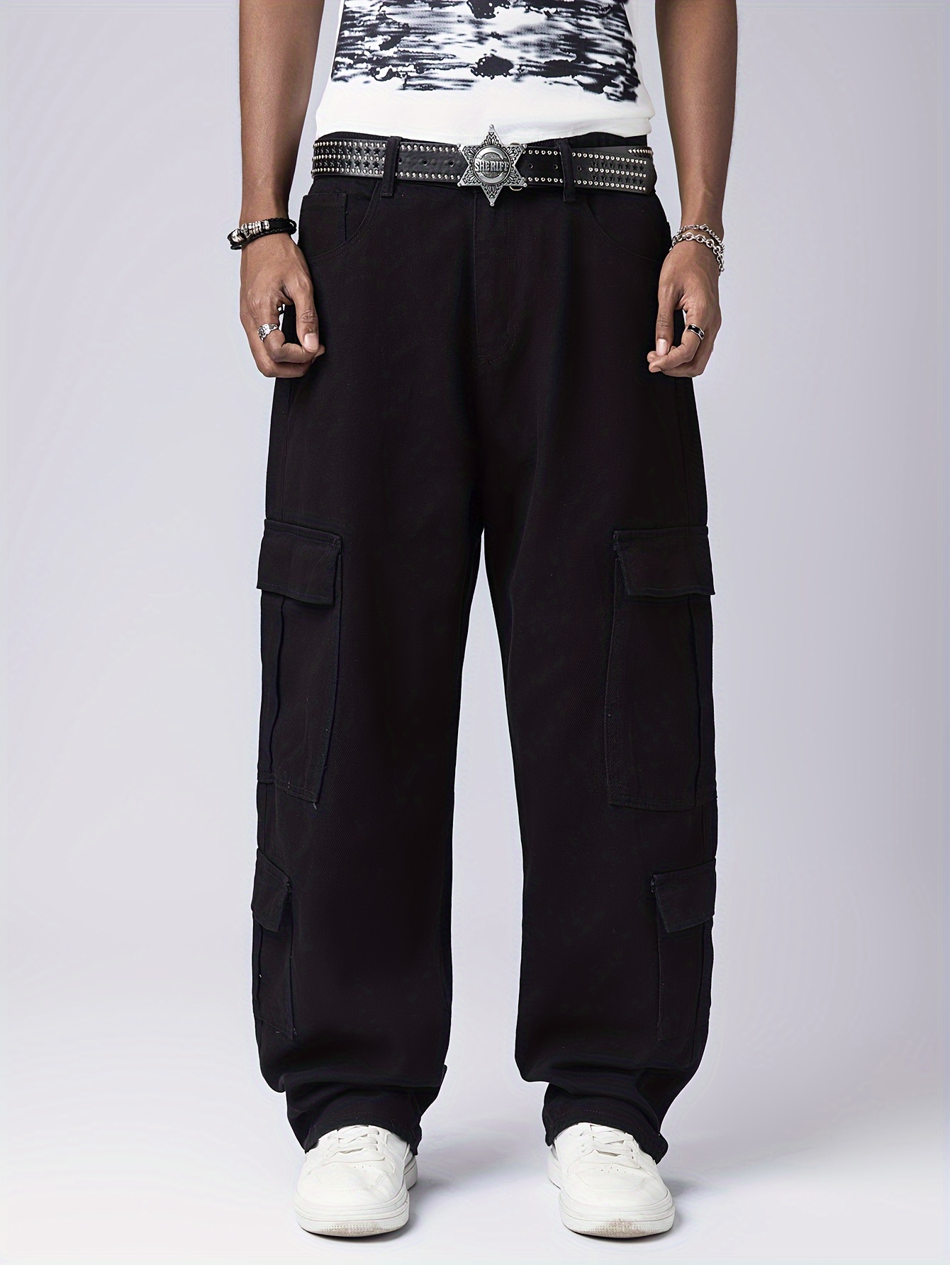 Men's Trendy Hip-Hop Style Loose Fit Cargo Jeans with Multiple Pockets - 100% Cotton, Machine Washable