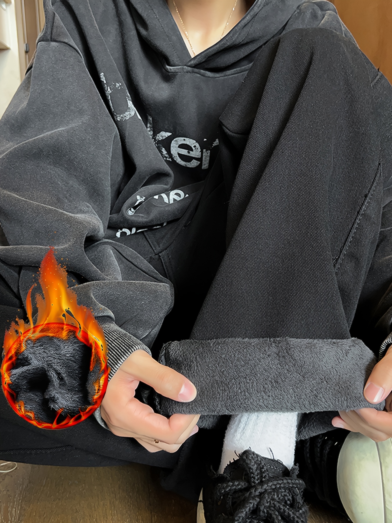 Men's Vintage-Inspired Fleece-Lined Jeans - Casual Straight Leg Denim for Fall/Winter, Machine Washable